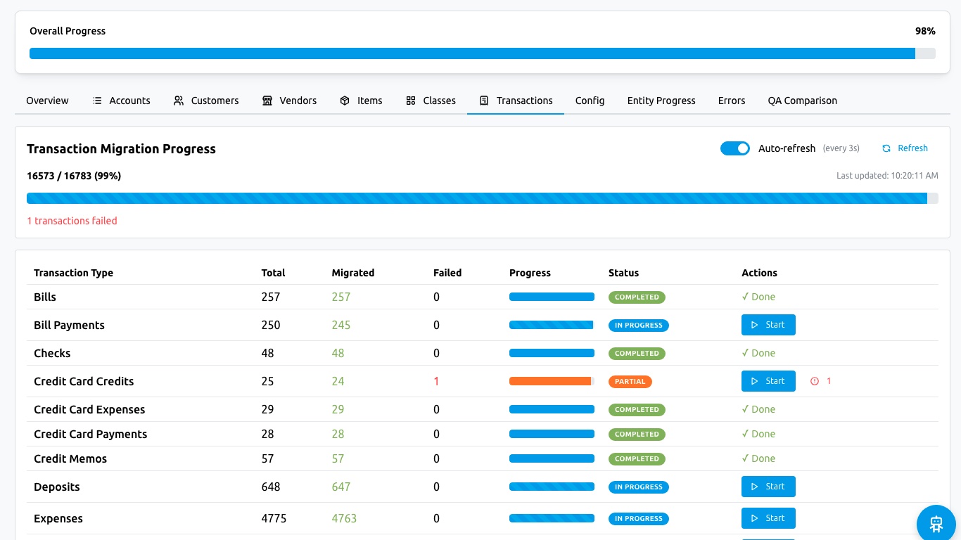 | Data Migrated | 1 year of month-end trial balances | Full transaction-level history |