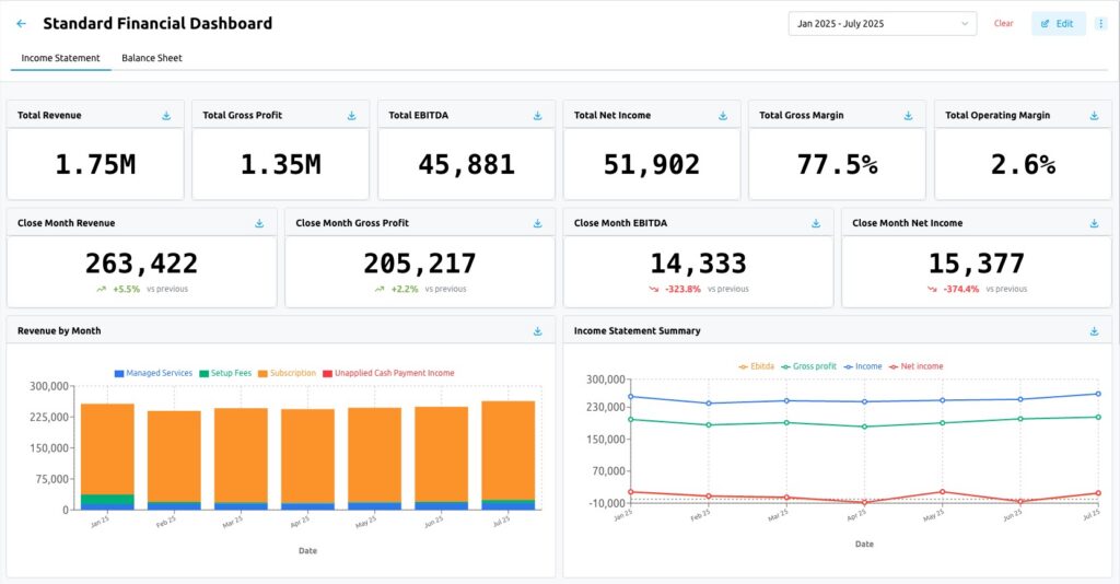 Build clean, board-ready dashboards in minutes instead of weeks.